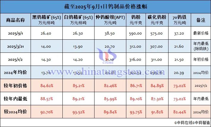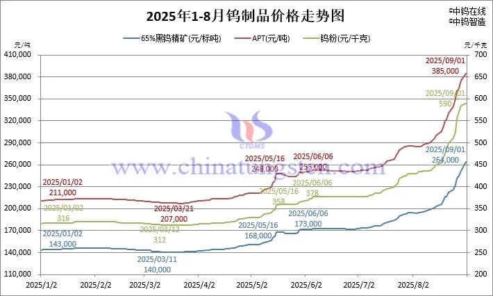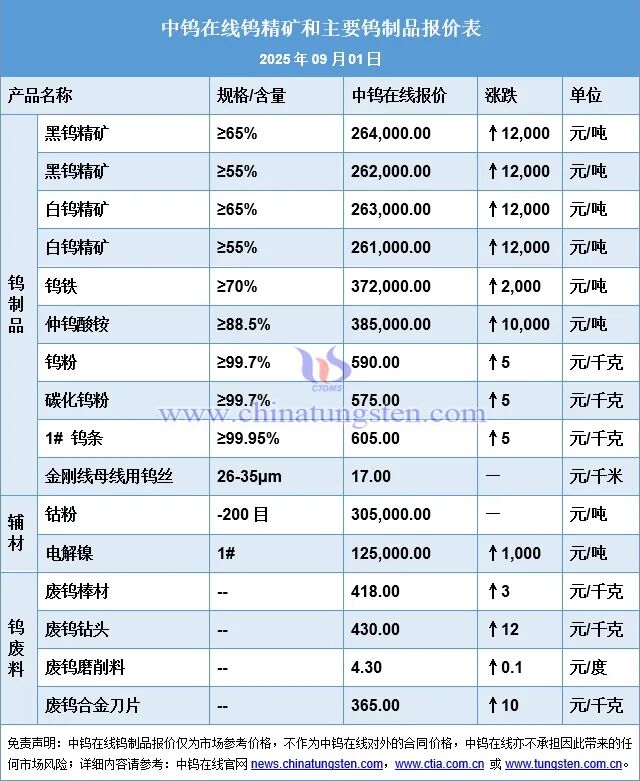 2025年9月1日钨价格一览 2025年9月1日钨市场行情 9月钨市坚挺开篇,延续“日涨万金”的行情热度。市场高涨情绪部分由供应端偏紧驱动,部分由投机资金活跃支撑。9.3献礼以前市场多持乐观预...